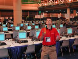 | I met Peter and John for an undistinguished breakfast at the conference center, then we started work. Attendance at the labs was fitful; we’d get a spurt of 10-15 people, then they’d all finish and leave and things would be quiet for a while. Eventually, our Microsoft sponsor decided to set out a huge pile of T-shirts, and that was a sight to see! You’d have thought we were giving out free money the way people descended on the T-shirt stacks. I saw one lady take six of them. Considering the prevalence of Microsoft logo-wear among the attendees, I wouldn’t have thought anyone would want any more of it. The puzzle block sets were very popular. In fact, John threatened to juggle in the aisle, but he never quite made it past our row of tables. |