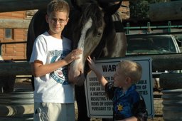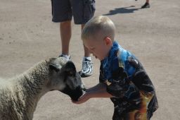 Mom had either mad-car disease or altitude sickness; she wasn’t feeling well, so she missed the morning festivities. The rest of us got sort of a late start because we were all tired, but once everyone got moving we headed out to two nearby attractions: Old McDonald’s Petting Zoo was first. It was, well, full of animals. Thomas was enchanted with the chicks in the incubator room, since you got to pick them up; Matt’s favorite was probably feeding the goats (see below), although he didn’t like it when they got too personal. David liked everything; he’s been a real treat to have with us on the trip because pretty much everything suits him just fine.