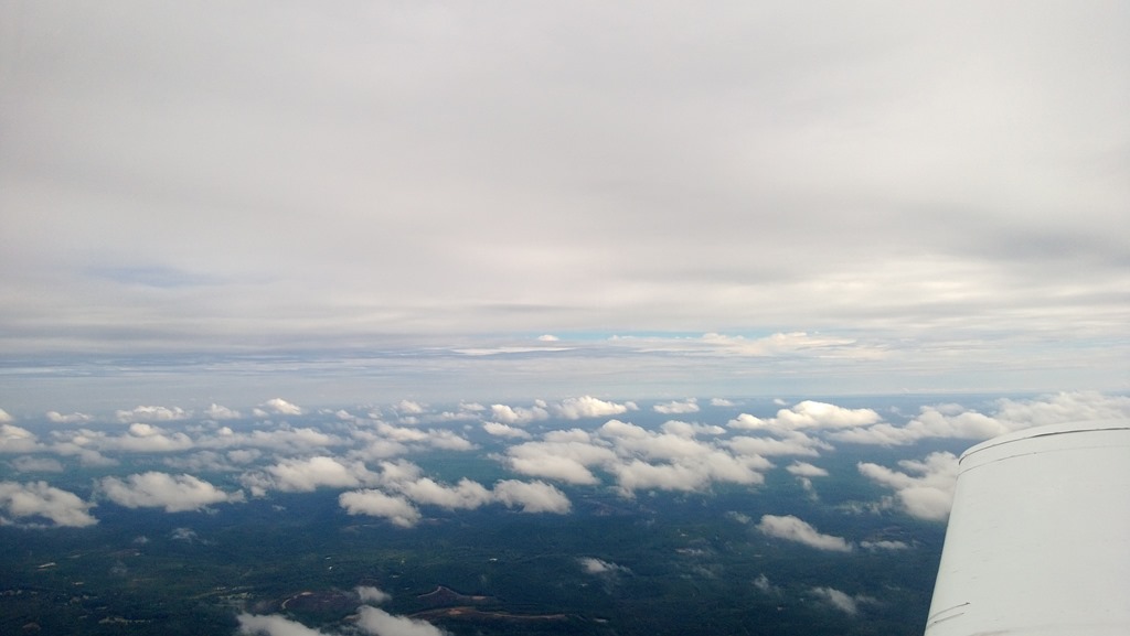 I say “actual” because you can log both simulated instrument time (in which you wear a view-limiting device such as this) or actual time. “Actual” in this context means you’re flying completely on instruments, without visual reference to the ground. In our case, that meant we were flying through a layer of clouds for a total of nearly 50 minutes. That meant that I had to control the airplane’s altitude, attitude, and course using only the instruments in the cockpit. All pilots are required to receive training on this, and to demonstrate proficiency in doing it, as part of the initial training process, but doing it in actual is quite a different matter. It’s very demanding work; you have to keep a consistent scan pattern on your instruments to make sure you’re holding course and altitude.