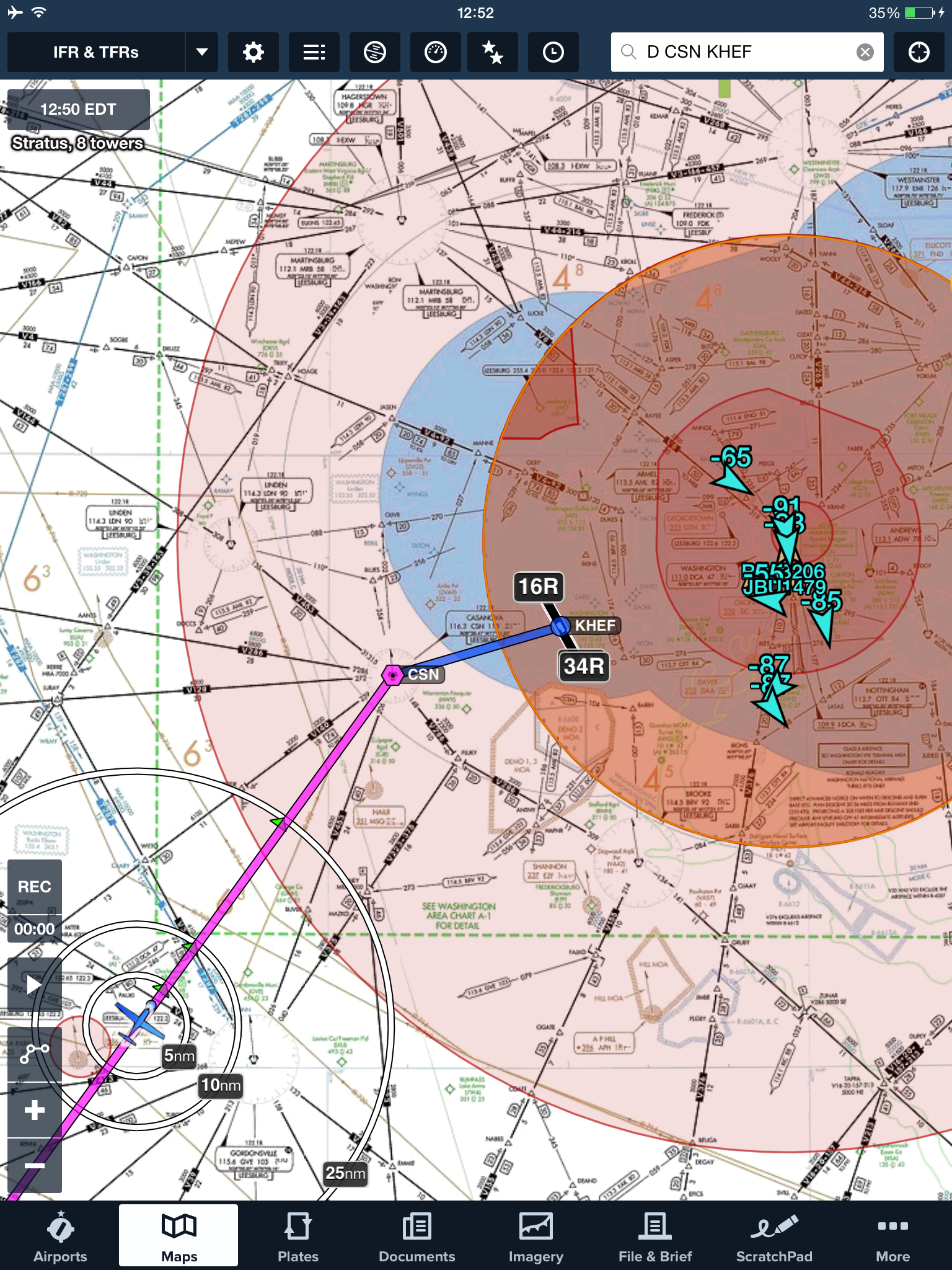 The flight into Manassas was perfectly uneventful, just the way I like. I had filed direct from Winston-Salem to Manassas, but I didn’t expect to get that routing, and sure enough, I didn’t; Potomac Approach sent me direct to the Casanova VOR, then direct Manassas. It was fun watching the Foreflight traffic display en route, since I could see a ton of traffic into Reagan.