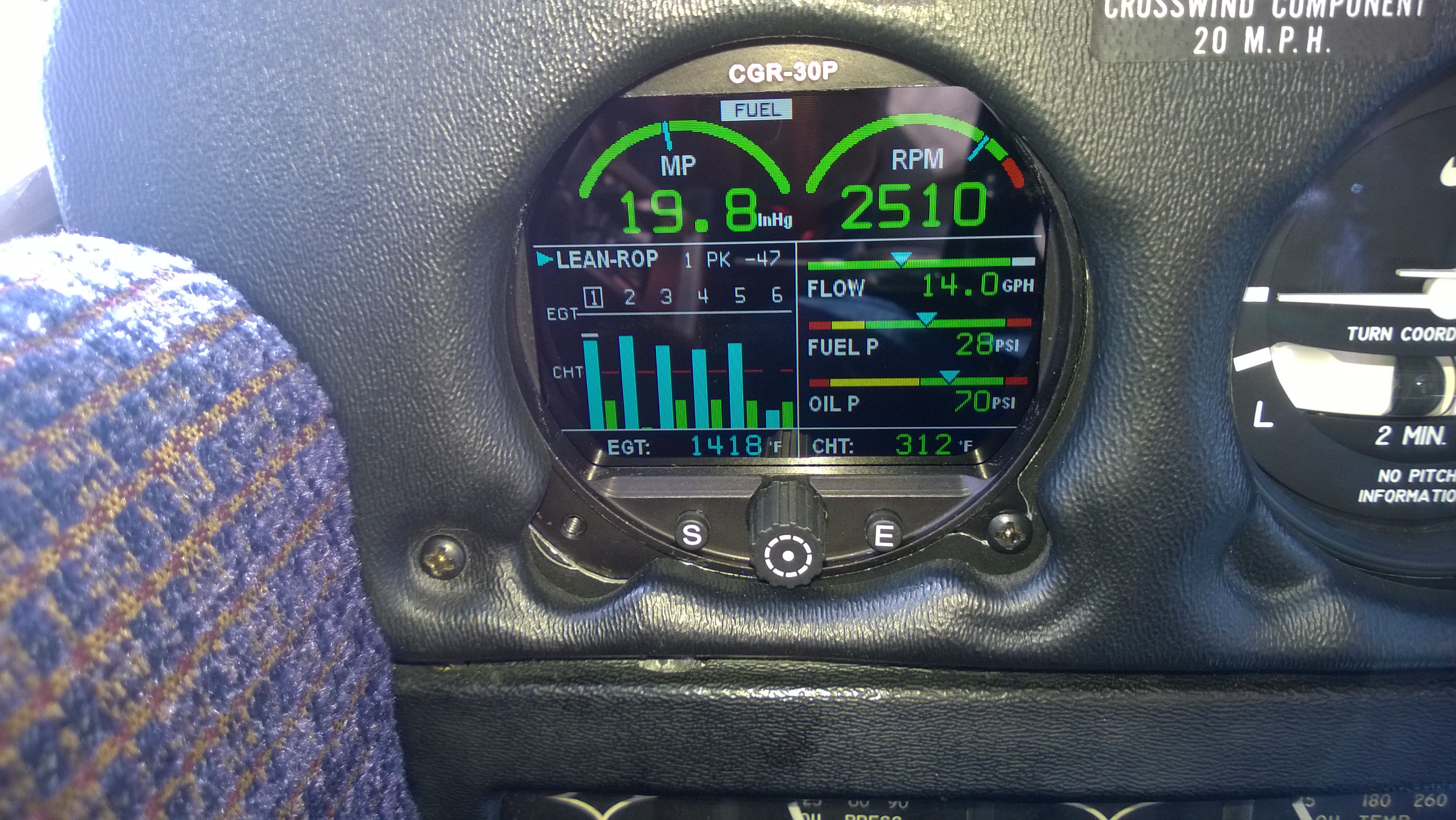 The control scheme is simple; the “S” pushbutton sequences between different screens on the lower half of the instrument. The rotary knob (which can be pushed to select) moves a small carat cursor around between fields. The “E” button exits what you’re currently doing. This takes a little practice, but it’s easy to learn. For example, if I want to lean the engine, I press S until I see the CHT display, then use the rotary knob to select the CHT display type, press the knob in, and dial it until it reads “CGT ROP” or “CGT LOP.” Easier said than done.