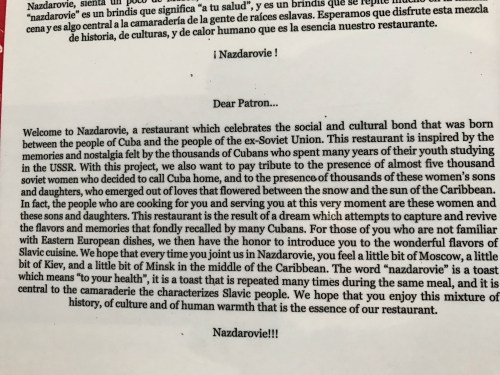 We had planned to take some pictures of the banner hanging from the balcony of El Presidente. When we went in, however, the balcony was full of Danish tourists. The owner came over, all 6’4″ of him, seemingly pissed off, and we explained what we wanted– then Warren mentioned that we’d been in the day before. “That was you?” the owner rumbled in a strong Slavic accent. “You drank 21 daquiris. Is new record. Thought was my friends! You come back one hour.” So we did. We went next door to Nazdarovie, the most unique restaurant I’ve ever been to. It is a Soviet-themed (not Russian) restaurant, in the capital of the Soviet Union’s biggest client state, serving traditional Russian dishes and decorated with all sorts of Cold War-era propaganda. Here’s how the menu sums up their origin story: