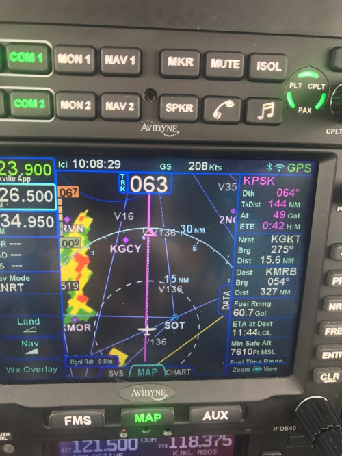 As we got closer to GEV, the wind diminished a bit, although not enough to give us any appreciable speed increase. The Ashe County airport sits at about 3000′ above sea level, and the airport description helpfully notes “RISING TERRAIN ALL QUADRANTS,” so flying in means dealing with shifting winds funneled in various directions by the surrounding terrain. Despite the wind, I stuck the landing, and we were well and cheerfully served by the airport manager, who coaxed the balky full-service pump into working long enough to fill the tanks. I’d happily stop there again. (Note that KGEV has no AT&T cell service and no diet Coke in the soda machine, so plan accordingly.)
