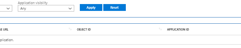 First stop, the “Enterprise Applications” blade of the Azure portal. Note the list below is the default view, and it’s all you get– a naive user might assume that the list shows all applications in the AAD tenant because the filters are set to “application status any” and “application visibility any,” and the list appears to go from A through W.