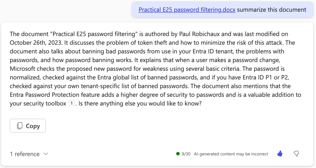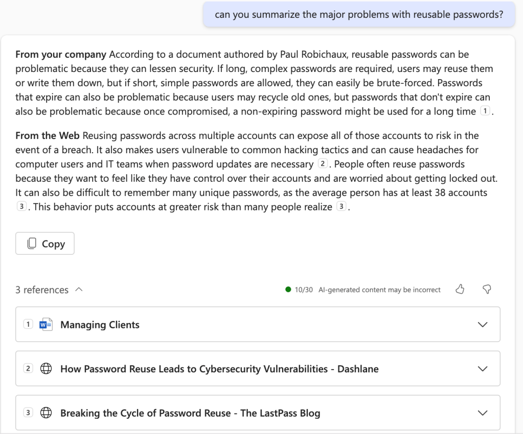 I then asked a more generic question: “can you summarize the major problems with reusable passwords?” The Copilot response here was excellent: it included some “company” documents plus a web search. Because I have multiple “company” documents that are relevant, I think it could be argued that the company summary could be richer or more detailed, but this is a quite good response overall. Thumbs up.