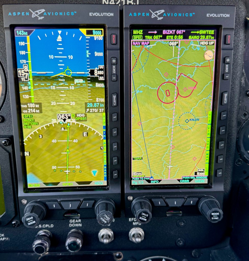 We started with slow flight, then power-off and power-on stalls, steep turns, and the Vmc demo. Even though I’d beat it into my head already, Max did me the favor of asking for clearing turns for each maneuver—so we’d fly a maneuver to the north, do a clearing turn to the south, then do the next thing, then back north, etc. After the Vmc demo, he had me demonstrate an in-flight shutdown of the failed engine, followed by a restart. I was following the checklist procedure, which requires use of the boost pumps, but he had me turn them off to avoid flooding the engine.