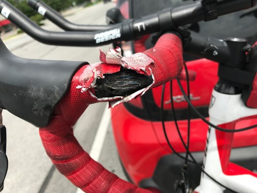 The first mile of the course went by smoothly and quickly. I was keeping an eye on my pace because 40Km was about a third farther than my previous longest ride, and about half again as long as my previous longest race, but I was still feeling great as I rounded the turn near mile 2… and then suddenly it seemed like the bike was slowing down. I pedaled faster. This had no effect other than to rock me back and forth in the saddle. “Maybe I need to shift some more,” I thought. So I did, fiddling with the bike’s four shift levers in a fruitless effort to stop decelerating. Finally I had to unclip and pull over, where after some experimentation I found that the freewheel gear inside the rear hub had broken or something. Pedaling turned the crank, which moved the chain, which turned the rear cassette, which did nothing to the back wheel. I fiddled with it for another 10 minutes or so, to no avail; then I reluctantly turned the bike right side up and started the Walk of Shame back to the corral.