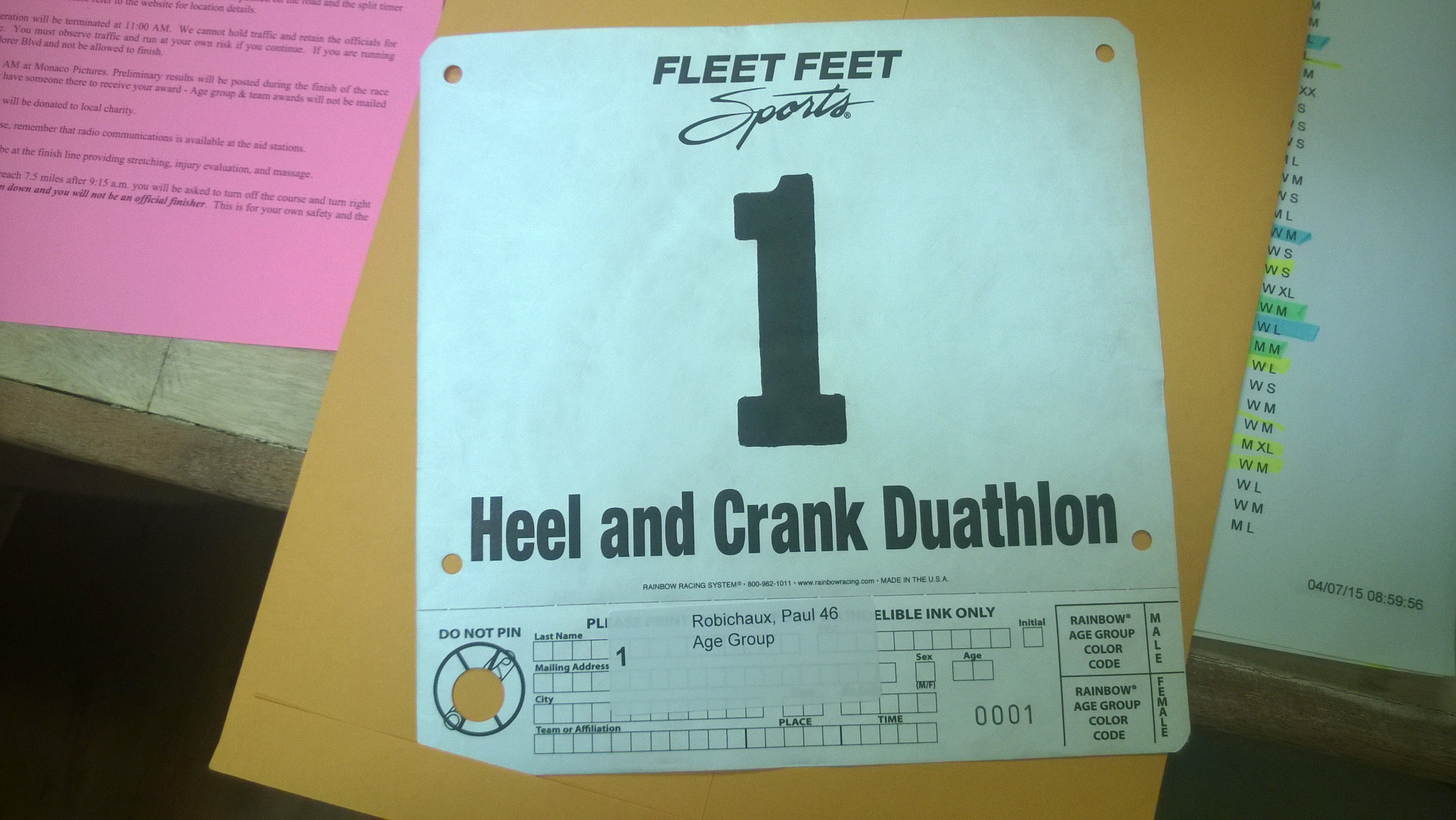 This was a point-to-point race: all our bike stuff went in 1 bag, and all our run stuff in another. We dropped the bike bag off with the bike and gave the run bag to the organizers, who staged it at T2 for us. This put a very high premium on making sure the right stuff was in the right bag, which for the most part I got right. However, that process adds some mental stress, even if you’re a heavy checklist user, as I am.